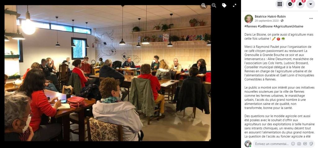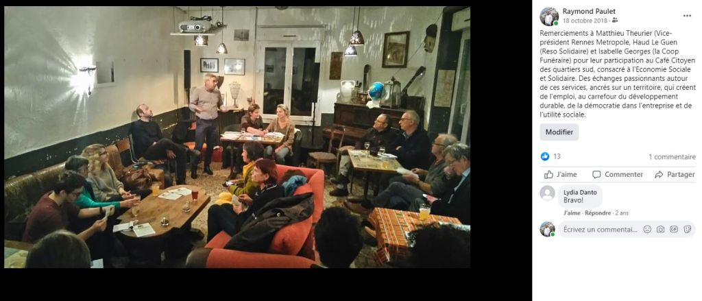 J’anime depuis 6 ans le café citoyen Les Suds, organisé sous l’égide du Conseil de quartier Francisco Ferrer Landry Poterie, auquel se sont aujourd’hui associés le Conseil de quartier Sud-gare et celui du Blosne. De septembre à mai, à raison d’un rendez-vous chaque mois, les habitants des quartiers rennais sont invités à débattre avec des intervenants autour d’un thème. Dans l’esprit de l’éducation populaire, ces rencontres ouvertes à tous doivent permettre l’échange le plus libre et le partage des savoirs.